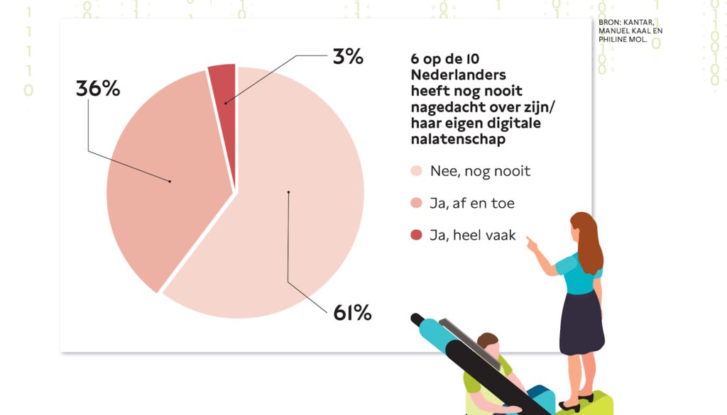Heeft u nog nooit aan uw online erfenis gedacht? U bent niet de enige. Uit gegevens van onderzoeksbureau Kantar blijkt dat maar drie op de tien Nederlanders bekend is met het begrip digitale nalatenschap. Misschien denkt u nu: ik doe helemaal niet zoveel online, dus ik en mijn nabestaanden hoeven ons nergens zorgen om te maken. Maar uw digitale leven is waarschijnlijk omvangrijker dan u zich realiseert.