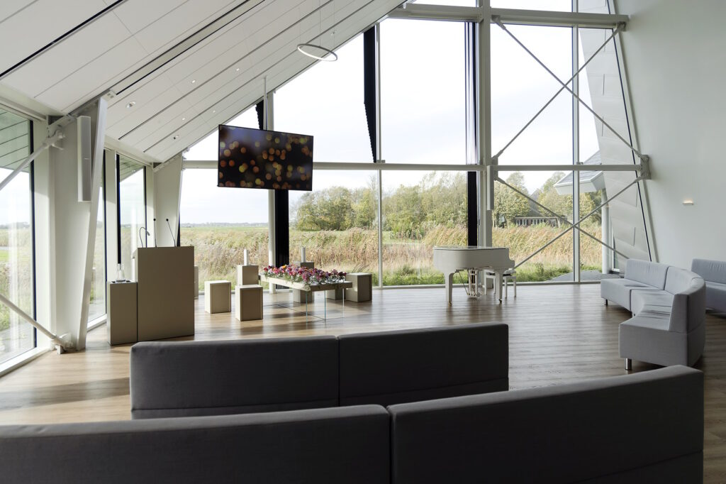 Crematorium Alkmaar beschikt over twee ceremonieruimtes die voorzien zijn van moderne techniek voor muziek en beeld. Deze ruimtes hebben hoge plafonds, een ruimtelijke en lichte uitstraling en het weidse uitzicht over het polderlandschap van Egmond. Na de ceremonie kunt u samenkomen en napraten in ons Grand Café.